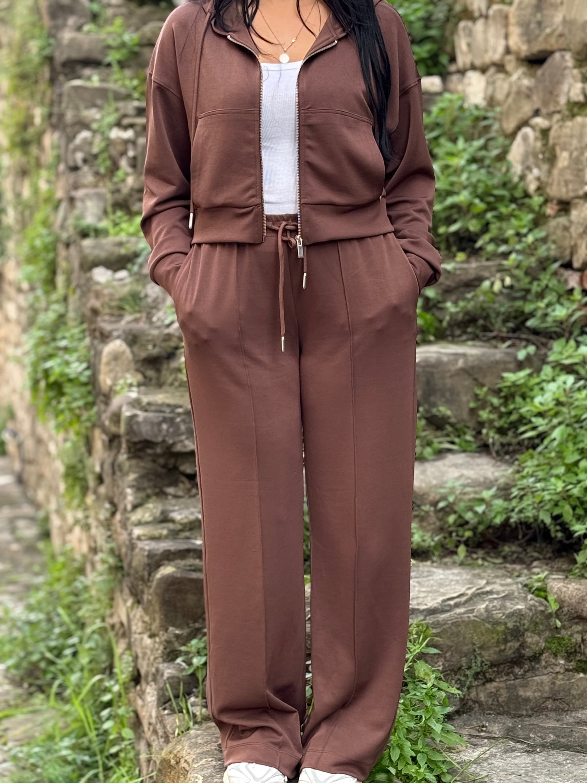Ky set përfshin xhaketë me kapuç dhe pantallona të gjera me brez elastik. Ideale për kombinime komode dhe moderne çdo ditë.